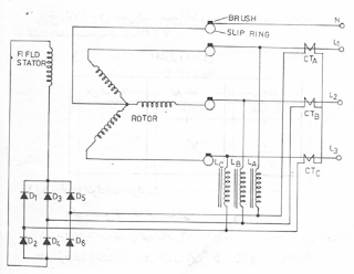 المتردد الثلاثى الاوجه 1 , و يتم تثبيت على نفس عمود الدوران مولد اناره Exiter وهو مولد صغير يقوم بغذيه ملفات المجال